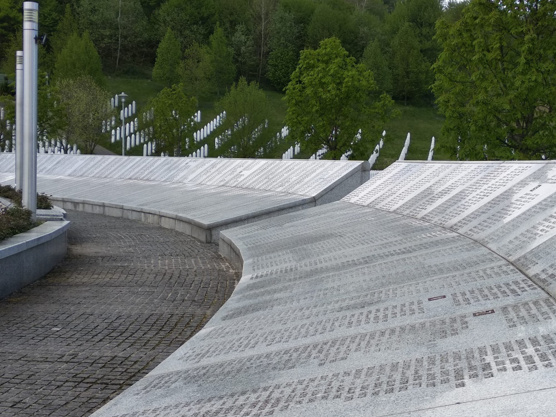 Retomamos la conversación pausadamente poco después en las inmediaciones de la nave, mientras se encendía un cigarrillo y veíamos llegar nuevos autobuses escolares. Entonces cruzamos la carretera caminando hasta llegar al memorial. En él, se disponían alrededor de una pequeña mezquita sólo cubierta por un tejado ─prácticamente al aire libre ─ un gran semicírculo de mármol con los nombres de todas las personas allí asesinadas. Al estar por orden alfabético atendiendo al apellido, era fácil contemplar cuánta gente de la misma familia había muerto. Y eran muchísimos. Tras el semicírculo, se encontraban las tumbas o, más bien, dónde deberían estar enterrados. Al terminar la visita, Haris se me acercó de nuevo y nos dirigimos hacia el aparcamiento. Apoyados en el coche, sacó un par de bocadillos vegetales y charlamos mientras comimos.